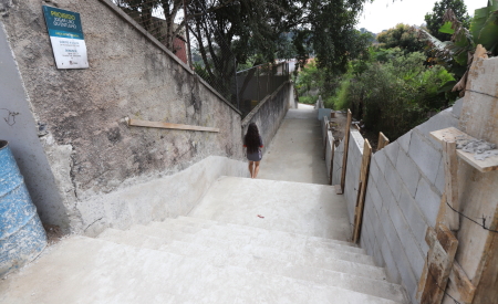 Importante rota de acesso para estudantes e moradores do Bandeira Branca II, a viela que liga o Conjunto Habitacional com a parte mais baixa do bairro está em fase final de obras, com pavimentação da escadaria, nivelamento, iluminação em LED e implementação de todos os itens de segurança e acessibilidade.
