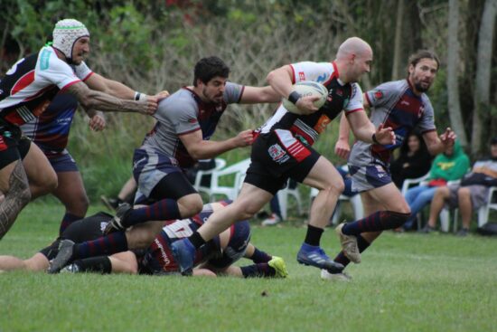 Legenda: Eduardo Garcia, com a bola, em duelo contra o Curitiba no Brasileiro 2023 – Foto Ícaro Leal/Jacareí Rugby