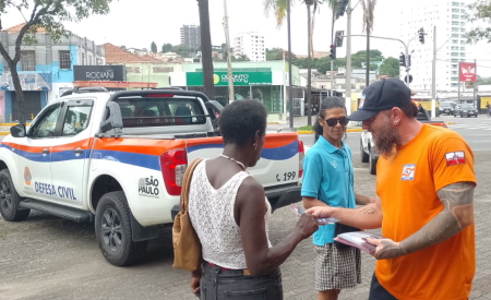 Durante as abordagens, os agentes informam sobre a previsão meteorológica, entregam panfletos informativos e orientam sobre como minimizar o risco de desastres diante de um momento de emergência.