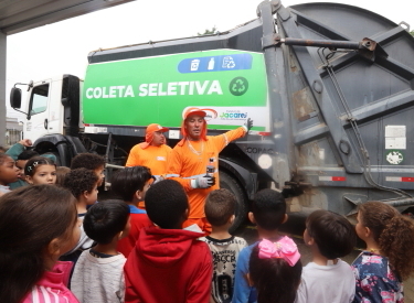 Caminhão da coleta seletiva visita escola de Jacareí para aula prática sobre descarte correto de lixo