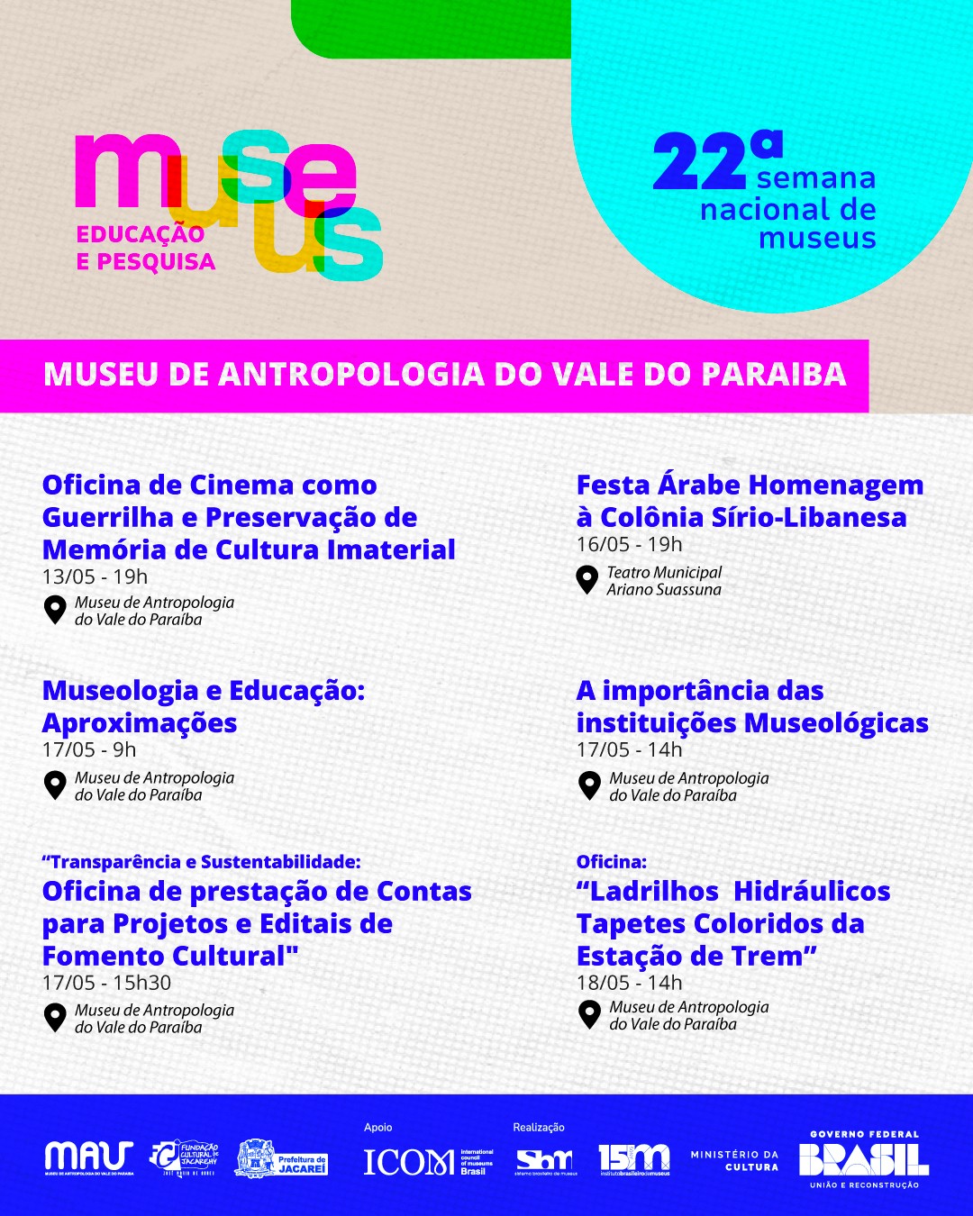 O Museu de Antropologia do Vale do Paraíba (MAV), por meio da Fundação Cultural de Jacarehy (FCJ), anuncia sua participação na 22ª Semana Nacional de Museus (SNM), uma iniciativa que busca fomentar o diálogo entre museus e a sociedade. Este ano, a SNM adota o tema “Museus, Educação e Pesquisa”, definido pelo Conselho Internacional de Museus (ICOM) em celebração ao Dia Internacional dos Museus, em 18 de maio.