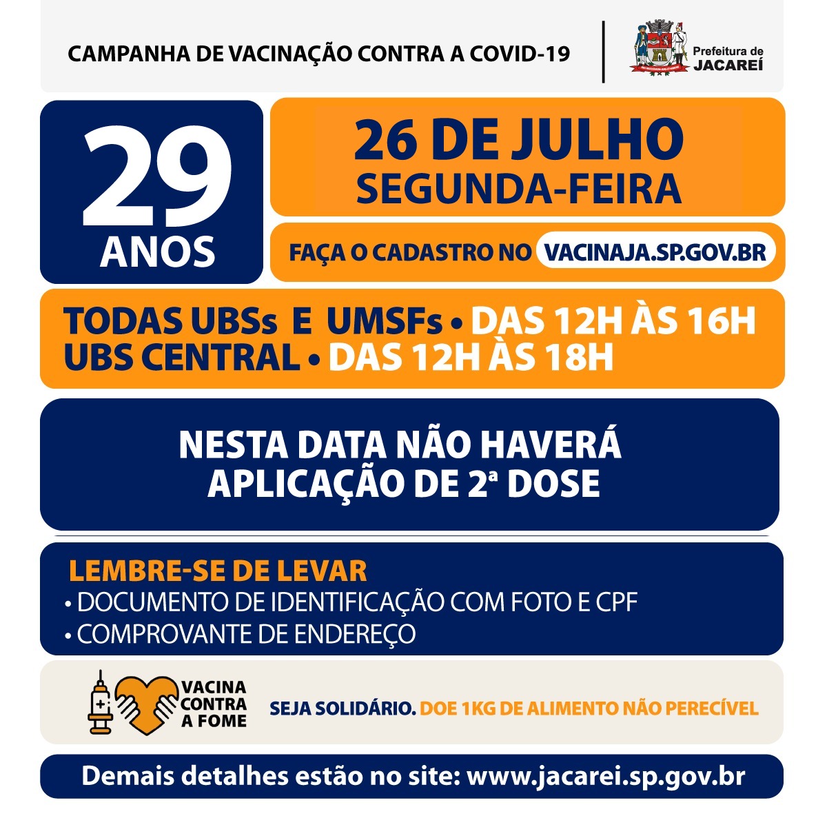 A Prefeitura de Jacareí, por meio da Secretaria de Saúde, irá aplicar a vacina contra a Covid-19 em pessoas de 29 anos na segunda-feira (26). Nesta data não haverá aplicação de segunda dose.