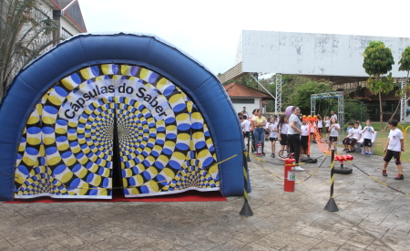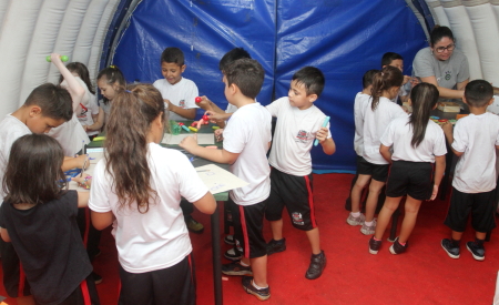 Legenda: Alunos visitam a Cápsula do Saber na EMEF Décio Moreira