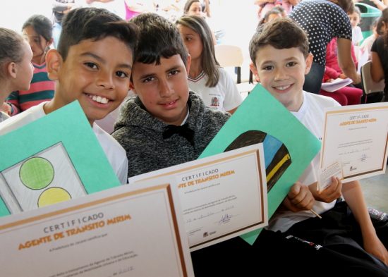 Nessa quarta-feira (12) foi a vez dos alunos da Emef Aluízio do Amaral receberem seus Carteirinhas de Agente de Trânsito Mirim, Certificado de Honra ao Mérito e Habilitação Simbólica pela participação no projeto. Estiveram presentes na formatura representantes das secretarias de mobilidade urbana e educação, pais dos alunos e o corpo docente da escola.