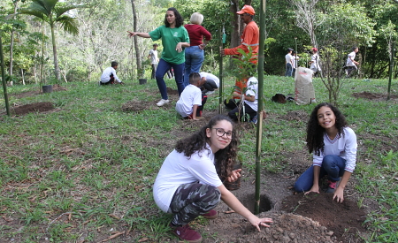 Alunos do quarto ano da EMEF Barão de Jacareí plantaram nesta segunda-feira (25), 28 mudas de árvores frutíferas nativas, de diversas espécies, no Viveiro Municipal “Seo Moura”.