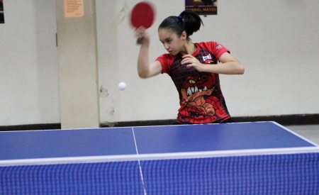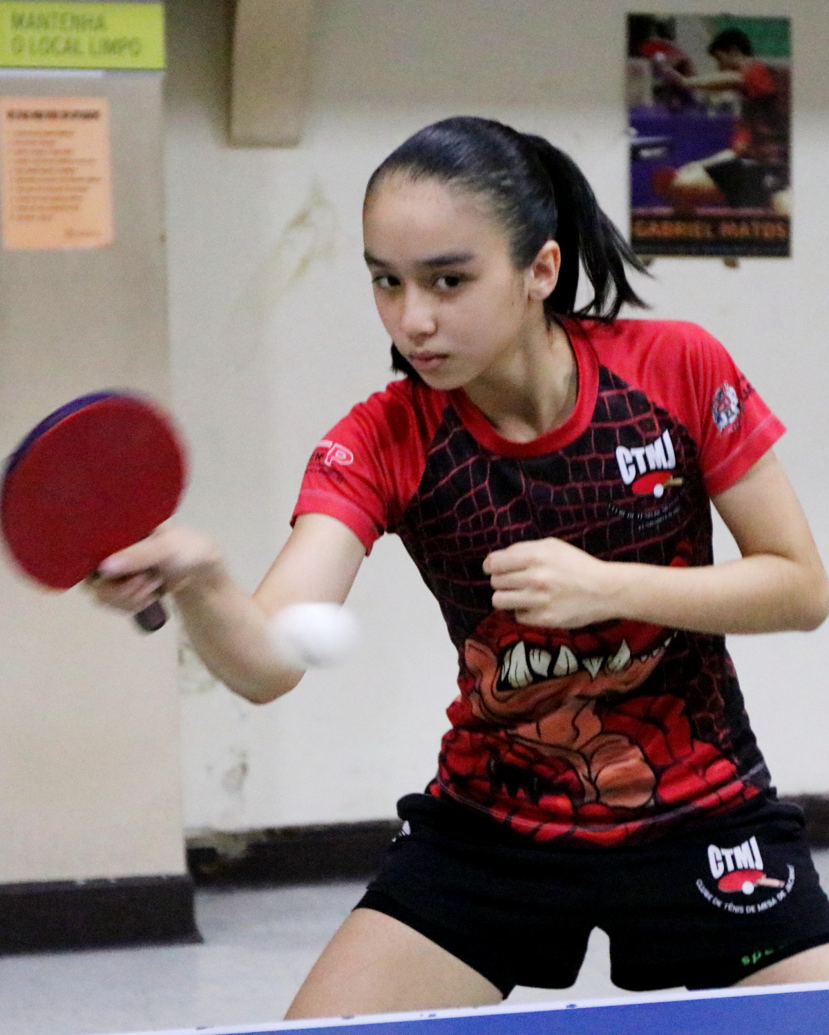 Legenda: Sofia Kano, representante da equipe de Tênis de Mesa de Jacareí, durante treinamento.