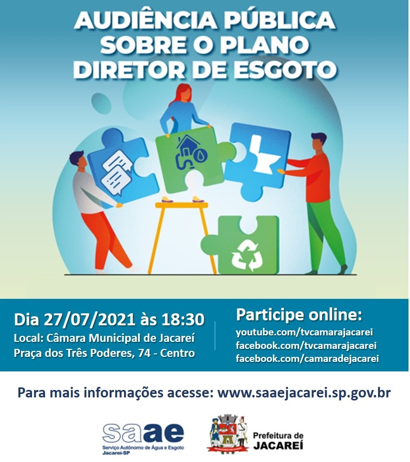 No dia 27 de julho, o SAAE (Serviço Autônomo de Água e Esgoto) realizará uma audiência pública às 18h30, sobre o Plano Diretor de Esgoto do Município de Jacareí (2020-2021).
