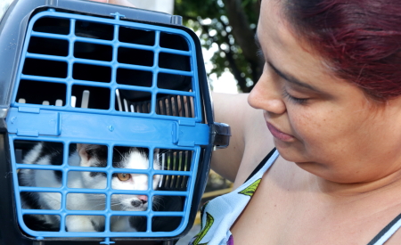 A Bruna Vieira Pimentel é auxiliar de enfermagem e levou quatro gatos para o mutirão. Como todos eles têm algum tipo de deficiência física, ela relata que a oferta da castração gratuita é uma oportunidade importante para minimizar os custos.