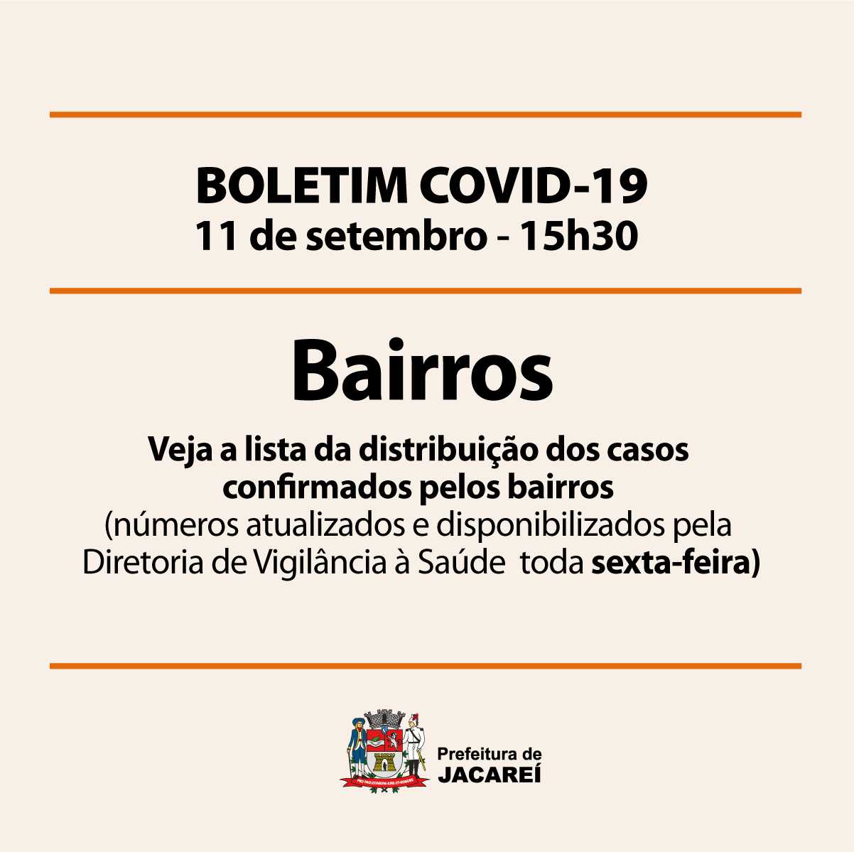 Bairros – Veja a lista da distribuição dos casos confirmados pelos bairros (números atualizados e disponibilizados pela Diretoria de Vigilância à Saúde toda sexta-feira): Altos de Santana 24, Altos de Santana II 8, Avareí 3, Balneário Paraíba 2, Bandeira Branca 62, Bandeira Branca II 13, Campo Grande 8, Centro 98, Chácaras Guararema 2, Chácaras Itapoã 3, Cidade Jardim 45, Cidade Nova Jacareí 54, Cidade Salvador 108, Condomínio Lagoinha 1, Cond Recanto dos Pássaros 1, Conj Habit Marinho 5, Conj São Benedito 27, Conjunto Vinte E Dois De Abril 2, Igarapés 42, Itapeva 1, Jardim Alvorada 7, Jardim América 6, Jardim Beira Rio 1, Jardim Bela Vista 28, Jardim Boa Vista 4, Jardim Califórnia 67, Jardim Coleginho 2, Jardim Colinas 45, Jardim Colônia 24, Jardim Conquista 5, Jardim das Industrias 48, Jardim das Oliveiras 9, Jardim Didinha 30, Jardim Dora 1, Jardim do Marques 5, Jardim do Portal 4, Jardim do Vale 33, Jardim Elza Maria 1, Jardim Emília 33, Jardim Esper 6, Jardim Esperança 10, Jardim Florida 42, Jardim Independência 3, Jardim Jacinto 30, Jardim Leblon 3, Jardim Liberdade 5, Jardim Luiza 6, Jardim Marcondes 16, Jardim Maria Amélia 34, Jardim Maria Amélia II 1, Jardim Maria Amélia III 1, Jardim Marister 4, Jardim Mesquita 10, Jardim Nova Esperança 38, Jardim Novo Amanhecer 12, Jardim Olímpia 5, Jardim Panorama 16, Jardim Paraíba 35, Jardim Paraiso 67, Jardim Paulistano 4, Jardim Pedramar 9, Jardim Pereira do Amparo 9, Jardim Pitoresco 9, Jardim Primavera 39, Jardim Real 6, Jardim Santa Maria 116, Jardim Santa Marina 49, Jardim Santa Monica 2, Jardim Santana 1, Jardim São Gabriel 12, Jardim São Jose 9, Jardim São Luiz 16, Jardim São Manoel 2, Jardim Siesta 5, Jardim Sol Nascente 9, Jardim Terras da Conceição 3, Jd Terras de Sta Helena 5, Jardim Terras de Santana 2, Jardim Terras de São João 14, Jardim Vera Lucia 3, Jardim Vista Verde 9, Jardim Yolanda 2, Lagoa Azul 9, Mato Dentro 2, Mirante do Vale 14, Paratei do Meio 1, Parque Brasil 5, Parque Califórnia 43, Parque dos Príncipes 93, Parque dos Sinos 24, Parque Imperial 27, Parque Itamaraty 24, Parque Meia Lua 100, Parque Nova América 10, Parque Santo Antônio 80, Pinho 1, Porto Velho 1, Primeiro de Maio 6, Residencial Brasília 1, Residencial São Paulo 9, Rio Abaixo 3, Rio Comprido 36, Santa Cruz dos Lazaros 15, Santa Paula 17,Sto Antônio da Boa Vista 22, São João 33,São Silvestre 7, Veraneio Ijal 9,Veraneio Irajá 6, Vila Aprazível 9, Vila Formosa 20, Vila Garcia 9, Vila Ita 6, Vila Machado 12, Vila Nova Aliança 5, Vila Pinheiro 12, Vila Romana 7, Vila São João 13, Vila São Judas Tadeu 2, Vila Zezé 24, Villa Branca 83, e Em Investigação 1.