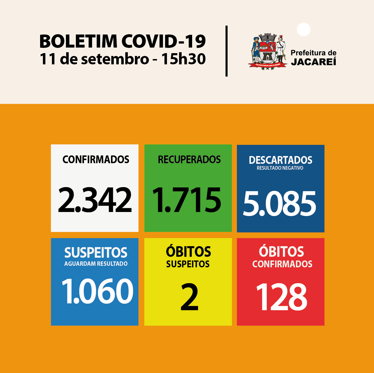 A Secretaria Municipal de Saúde de Jacareí informa, nesta sexta-feira (11), que Jacareí chegou a 2342 casos confirmados de COVID-19 no município. São 1230 homens e 1112 mulheres. Dos confirmados, estão internados 22 (oito em hospital público – sendo cinco em UTI –, e 14 em hospital privado – sendo seis em UTI). Há 477 em isolamento domiciliar. E 128 óbitos, até aqui.