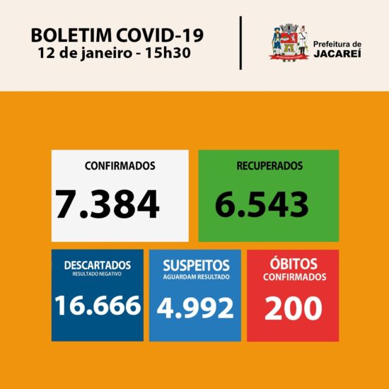 A Secretaria Municipal de Saúde de Jacareí, por meio da Diretoria de Vigilância em Saúde, informa, nesta terça-feira (12), que Jacareí está com 7.384 casos confirmados de COVID-19 no município. São 3.703 mulheres e 3.681 homens. Dos confirmados, estão internados 45 (15 em hospital público – sendo oito em UTI –, e 30 em hospital privado – sendo 15 em UTI). Há 641 confirmados em isolamento (internados e em casa). E 200 óbitos até aqui.