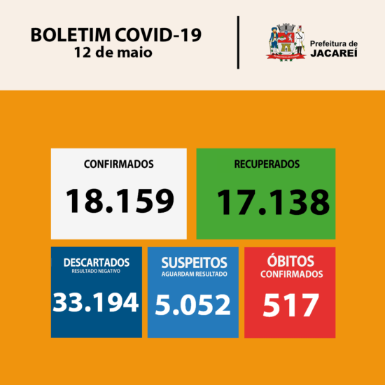 Jacareí está com 18.159 casos confirmados da doença. São 9.343 mulheres e 8.816 homens. Dos confirmados, estão internados 76 (32 em hospital público – sendo 13 em UTI –, e 44 em hospital privado – sendo 19 em UTI). Há 504 confirmados em isolamento (internados e em casa). E 517 óbitos até aqui.