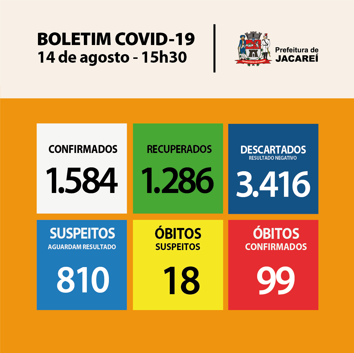 Jacareí chegou a 1584 casos confirmados da doença. São 822 homens e 762 mulheres. Dos confirmados, estão internados 32 (nove em hospital público – sendo um em UTI –, e 23 em hospital privado – sendo nove em UTI). Há 167 em isolamento domiciliar. E 99 óbitos, até aqui.