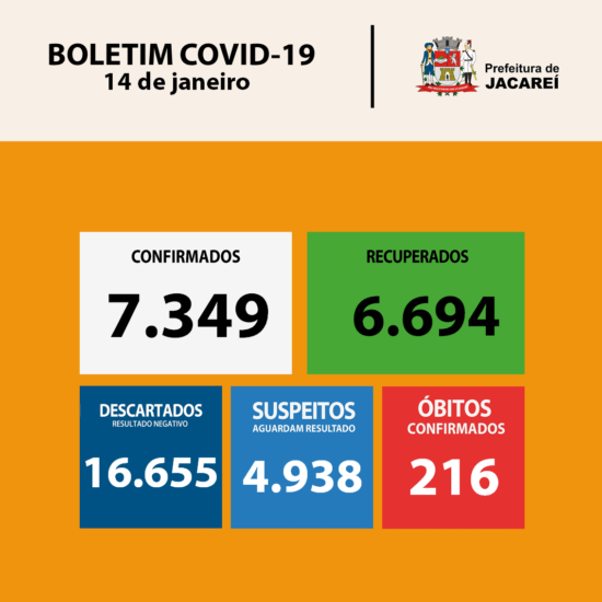 A Secretaria Municipal de Saúde de Jacareí, por meio da Diretoria de Vigilância em Saúde, informa, nesta quinta-feira (14), mais 12 óbitos por COVID-19 no município. Trata-se de nove homens (40, 49, 65, 66, 72, 72, 74, 80 e 89 anos) e três mulheres (37, 86 e 92 anos). Ao todo, foram sete óbitos em unidades de saúde privada, quatro em unidades públicas e um em sua residência. Uma das mortes ocorreu no dia 27 de dezembro. As outras ocorreram entre os dias 5 e 11 de janeiro. Apenas o homem de 49 anos não tinha comorbidades.
