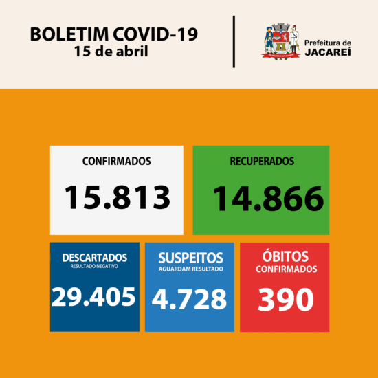 Boletim – Coronavírus – 15 de abril – 390 óbitos; 15.813 casos confirmados; 14.866 recuperados