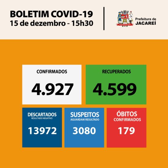 Jacareí está com 4927 casos confirmados da doença. São 2507 homens e 2420 mulheres. Dos confirmados, estão internados 18 (11 em hospital público – sendo sete em UTI –, e sete em hospital privado – sendo três em UTI). Há 149 confirmados em isolamento (internados e em casa). E 179 óbitos até aqui.