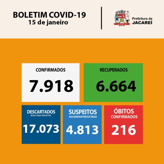 Jacareí está com 7.918 casos confirmados da doença. São 4.014 mulheres e 3.904 homens. Dos confirmados, estão internados 62 (29 em hospital público – sendo dez em UTI –, e 33 em hospital privado – sendo 13 em UTI). Há 1.038 confirmados em isolamento (internados e em casa). E 216 óbitos até aqui.