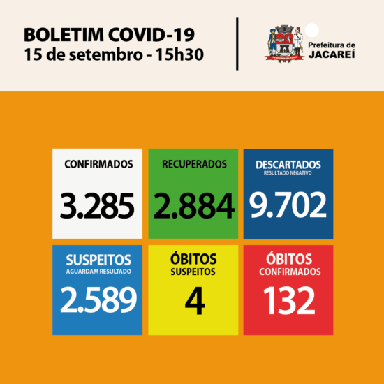 Jacareí chegou a 3285 casos confirmados* da doença (explicação da pequena redução na Nota Técnica da Vigilância à Saúde). São 1757 homens e 1528 mulheres. Dos confirmados, estão internados 22 (sete em hospital público – sendo quatro em UTI –, e 15 em hospital privado – sendo três em UTI). Há 247 em isolamento domiciliar. E 132 óbitos, até aqui (4,0% dos casos confirmados).