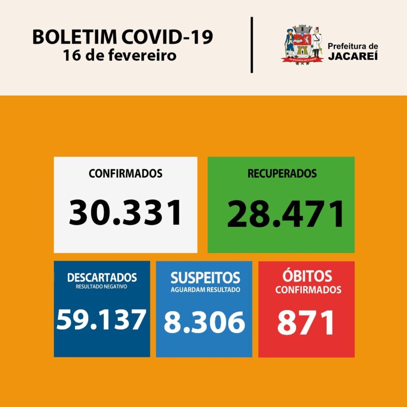 Jacareí está com 30.331 casos confirmados da doença. São 15.862 mulheres e 14.469 homens. Dos confirmados, estão internados 25 (dez em hospital público – sendo sete em UTI –, e 15 em hospital privado – sendo 12 em UTI). Há 989 confirmados em isolamento (em casa). E 871 óbitos até aqui.