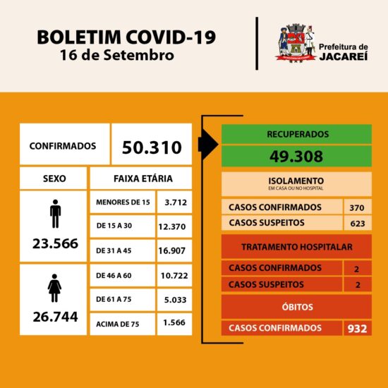 Jacareí está com 50.310 casos confirmados da doença. São 26.744 mulheres e 23.566 homens. Dos confirmados, estão internados dois (em hospital público – nenhum em UTI –, e nenhum em hospital privado). Há 370 confirmados em isolamento. E 932 óbitos até aqui.