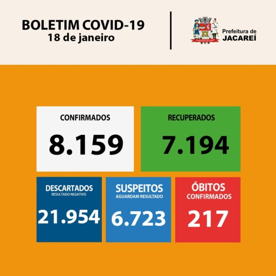 A Secretaria Municipal de Saúde de Jacareí, por meio da Diretoria de Vigilância em Saúde, informa, nesta segunda-feira (18), mais um óbito por COVID-19 no município. Trata-se de um homem de 88 anos, que tinha comorbidades e faleceu em uma unidade particular de saúde, no dia 14 de janeiro.