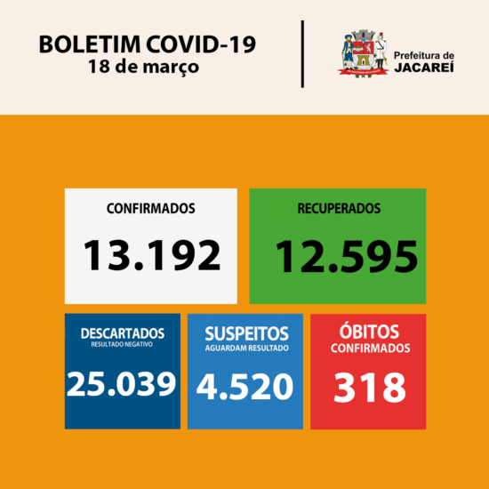 Vacina – Até o momento, 22.391 vacinas contra a Covid-19 foram aplicadas em Jacareí (15.919/1ª dose e 6.472/2ª dose). Clique aqui para mais informações sobre o andamento da Campanha de Vacinação no município.