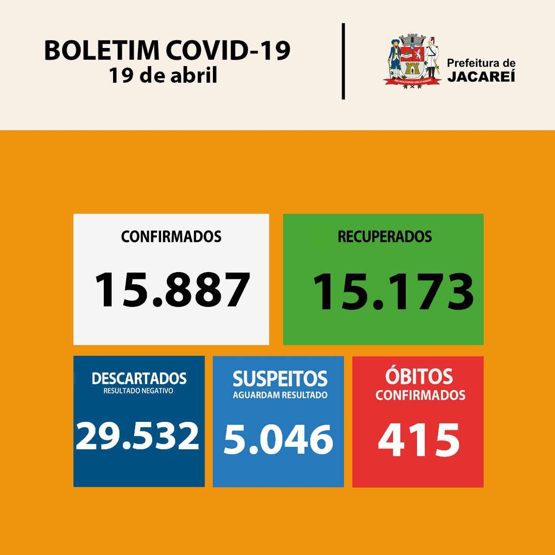 Jacareí está com 15.887 casos confirmados da doença. São 8.138 mulheres e 7.749 homens. Dos confirmados, estão internados 59 (26 em hospital público – sendo 14 em UTI –, e 33 em hospital privado – sendo 22 em UTI). Há 299 confirmados em isolamento (internados e em casa). E 415 óbitos até aqui.