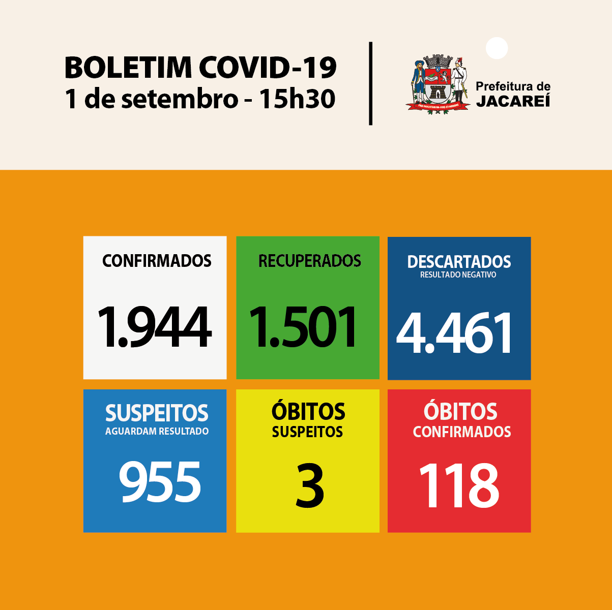 Jacareí chegou a 1944 casos confirmados da doença. São 999 homens e 945 mulheres. Dos confirmados, estão internados 17 (oito em hospital público – sendo um em UTI –, e nove em hospital privado – sendo cinco em UTI). Há 308 em isolamento domiciliar. E 118 óbitos, até aqui.