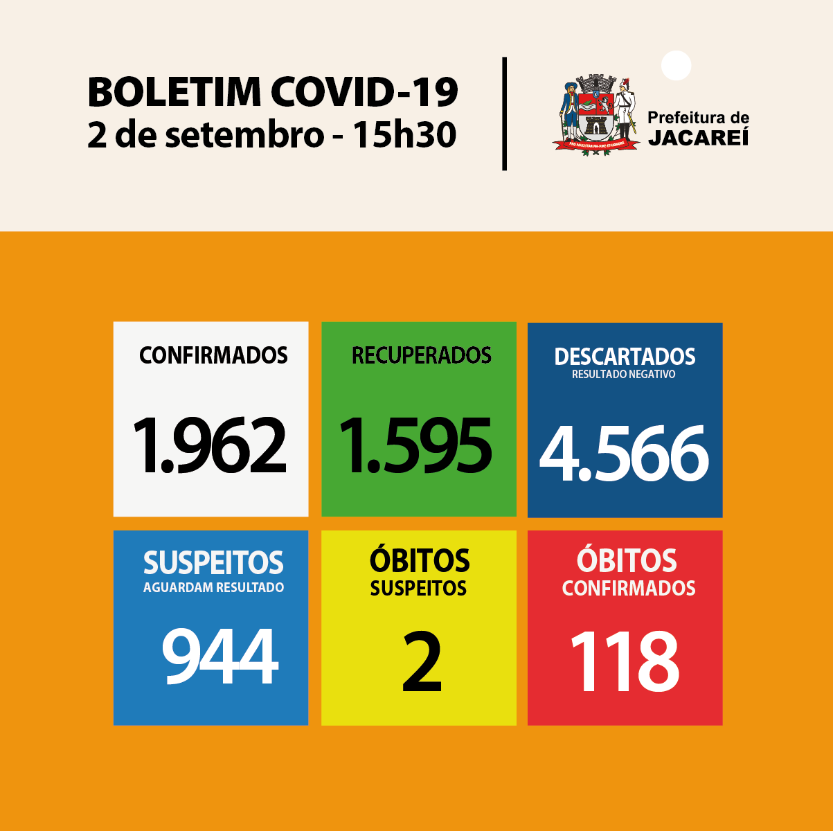 Boletim – Coronavírus – 2 de setembro – 1962 casos confirmados; 1595 recuperados