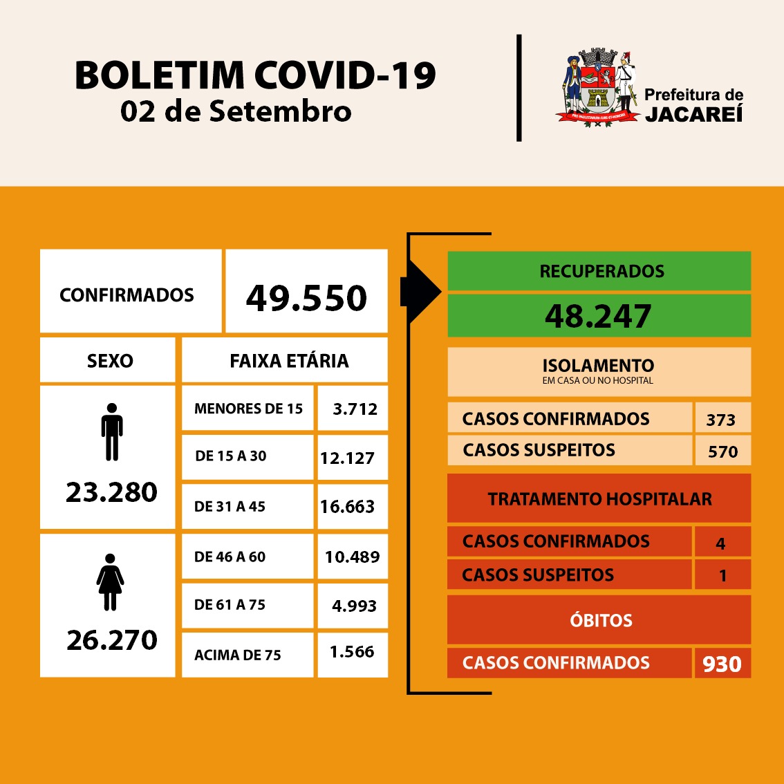 Jacareí está com 49.550 casos confirmados da doença. São 26.280 mulheres e 23.270 homens. Dos confirmados, estão internados quatro (três em hospital público – nenhum em UTI –, e um em hospital privado – sendo ele em UTI). Há 373 confirmados em isolamento (em casa). E 930 óbitos até aqui.
