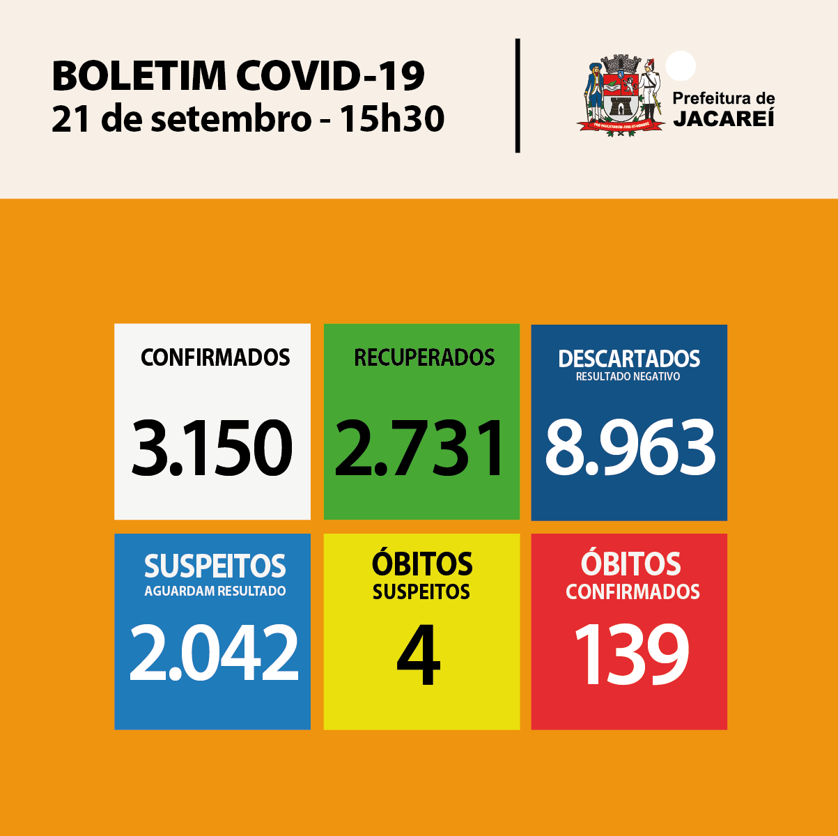 Jacareí chegou a 3150 casos confirmados da doença. São 1632 homens e 1518 mulheres. Dos confirmados, estão internados 19 (dez em hospital público – sendo quatro em UTI –, e nove em hospital privado – sendo quatro em UTI). Há 261 em isolamento domiciliar. E 139 óbitos, até aqui (4,4% dos casos confirmados).