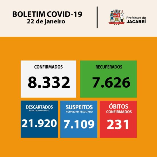 Jacareí está com 8.332 casos confirmados da doença. São 4.209 mulheres e 4.123 homens. Dos confirmados, estão internados 57 (32 em hospital público – sendo 11 em UTI –, e 25 em hospital privado – sendo 11 em UTI). Há 475 confirmados em isolamento (internados e em casa). E 231 óbitos até aqui.