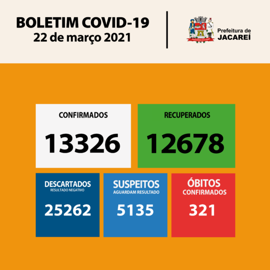 A Secretaria Municipal de Saúde de Jacareí, por meio da Diretoria de Vigilância em Saúde, informa, nesta segunda-feira (22), mais dois óbitos por COVID-19 no município. Trata-se de uma mulher, de 77 anos, que faleceu em uma unidade pública de saúde no dia 13 de março; e de um homem, de 72 anos, que também veio a óbito em uma unidade pública de saúde, no dia 16 de março. Ambos tinham comorbidades.