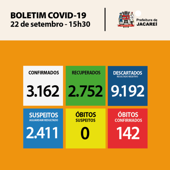 Jacareí chegou a 3162 casos confirmados da doença. São 1639 homens e 1523 mulheres. Dos confirmados, estão internados 23 (dez em hospital público – sendo três em UTI –, e 13 em hospital privado – sendo nove em UTI). Há 245 em isolamento domiciliar. E 142 óbitos, até aqui (4,4% dos casos confirmados).