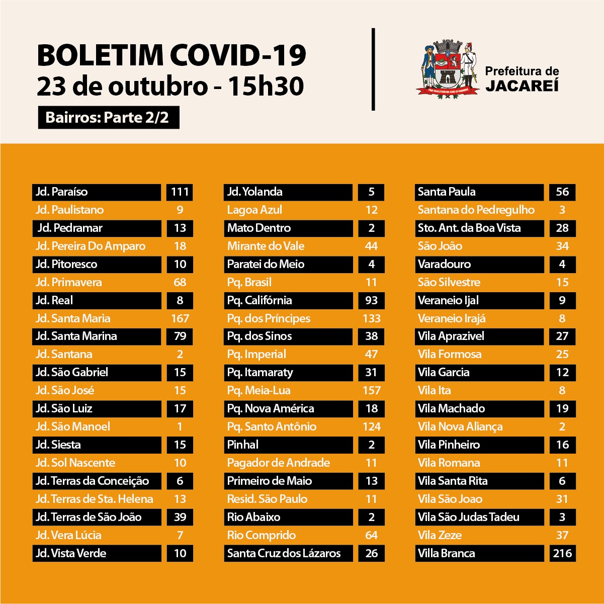 A Secretaria Municipal de Saúde de Jacareí informa, nesta sexta-feira (23), que Jacareí chegou a 3908 casos confirmados de COVID-19 no município. São 1997 homens e 1911 mulheres. Dos confirmados, estão internados cinco (dois em hospital público – sendo um em UTI –, e três em hospital privado – sendo dois em UTI). Há 176 em isolamento domiciliar. E 162 óbitos até aqui (4,1% dos casos confirmados).
