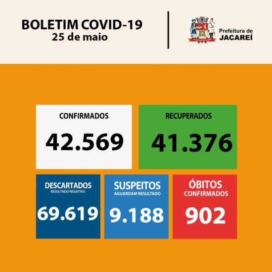 Jacareí está com 42.569 casos confirmados da doença. São 22.401 mulheres e 20.168 homens. Dos confirmados, estão internados dez (três em hospital público – nenhum em UTI –, e sete em hospital privado – três em UTI). Há 291 confirmados em isolamento (em casa). E 902 óbitos até aqui.