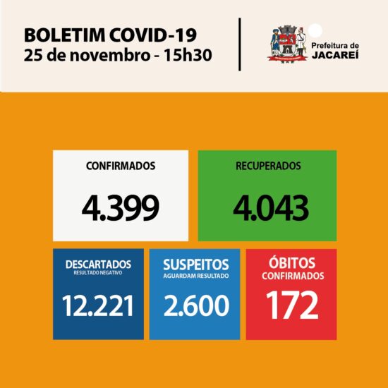 Jacareí está com 4399 casos confirmados da doença. São 2258 homens e 2141 mulheres. Dos confirmados, estão internados cinco (um em hospital público – este um está em UTI –, e quatro em hospital privado – sendo dois em UTI). Há 179 em isolamento domiciliar. E 172 óbitos até aqui (3,9% dos casos confirmados).