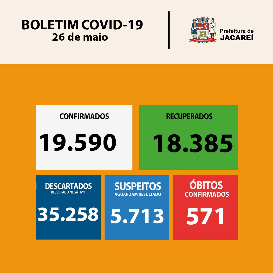 Jacareí está com 19.590 casos confirmados da doença. São 10.062 mulheres e 9.528 homens. Dos confirmados, estão internados 84 (36 em hospital público – sendo 14 em UTI –, e 48 em hospital privado – sendo 23 em UTI). Há 634 confirmados em isolamento (internados e em casa). E 571 óbitos até aqui.