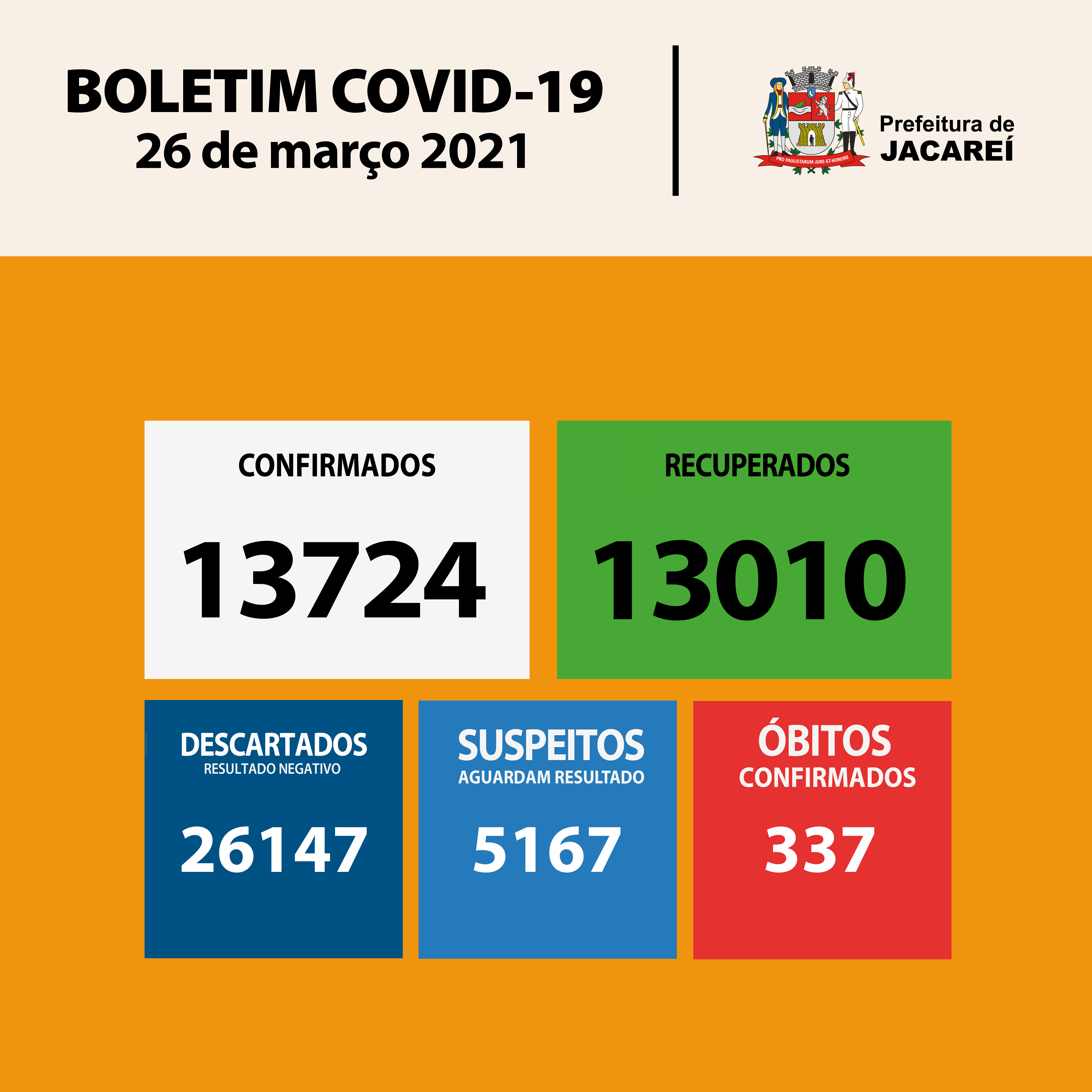 Jacareí está com 13.724 casos confirmados da doença. São 7.043 mulheres e 6.681 homens. Dos confirmados, estão internados 66 (29 em hospital público – sendo 15 em UTI –, e 37 em hospital privado – sendo 19 em UTI). Há 377 confirmados em isolamento (internados e em casa). E 337 óbitos até aqui.