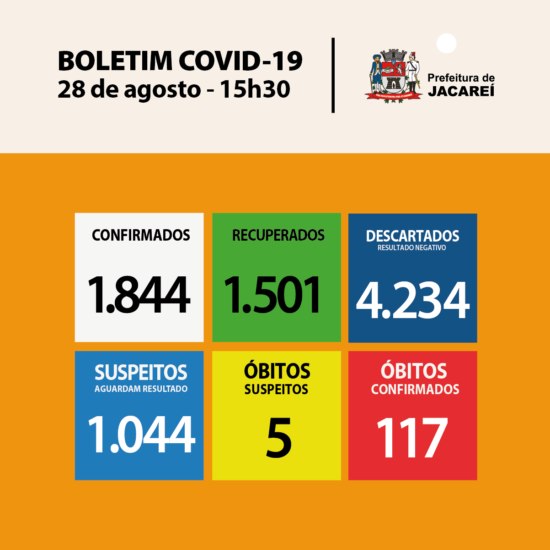 A Secretaria Municipal de Saúde de Jacareí informa, nesta sexta-feira (28), mais um óbito por COVID-19 no município. Trata-se de um homem de 64 anos, que faleceu no dia 25 de agosto, em unidade particular de saúde. Ele tinha comorbidades.