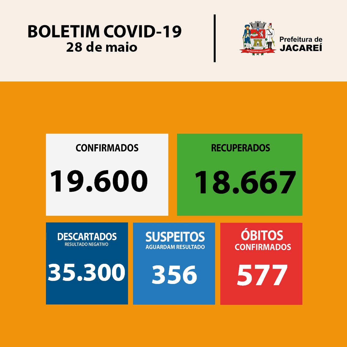 Jacareí está com 19.600 casos confirmados da doença. São 10.067 mulheres e 9.533 homens. Dos confirmados, estão internados 82 (33 em hospital público – sendo 18 em UTI –, e 49 em hospital privado – sendo 24 em UTI). Há 356 confirmados em isolamento (internados e em casa). E 577 óbitos até aqui.