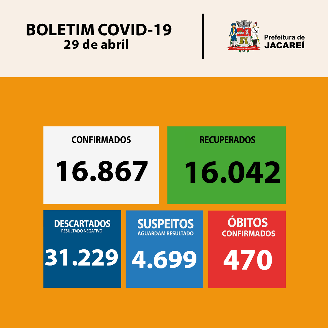 Jacareí está com 16.867 casos confirmados da doença. São 8.660 mulheres e 8.207 homens. Dos confirmados, estão internados 67 (33 em hospital público – sendo 15 em UTI –, e 34 em hospital privado – sendo 24 em UTI). Há 355 confirmados em isolamento (internados e em casa). E 470 óbitos até aqui.