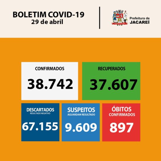 Jacareí está com 38.742 casos confirmados da doença. São 20.269 mulheres e 18.473 homens. Dos confirmados, estão internados seis (quatro em hospital público – sendo dois em UTI –, e dois em hospital privado – sendo um em UTI). Há 238 confirmados em isolamento (em casa). E 897 óbitos até aqui.