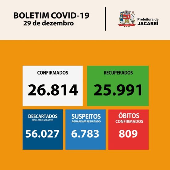 Jacareí está com 26.814 casos confirmados da doença. São 13.806 mulheres e 13.008 homens. Dos confirmados, estão internados cinco (três em hospital público – sendo dois em UTI –, e dois em hospital privado – sendo um em UTI). Há 14 confirmados em isolamento (em casa). E 809 óbitos até aqui.