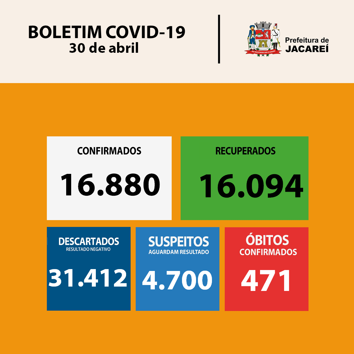 Jacareí está com 16.880 casos confirmados da doença. São 8.664 mulheres e 8.216 homens. Dos confirmados, estão internados 62 (27 em hospital público – sendo 14 em UTI –, e 35 em hospital privado – sendo 23 em UTI). Há 315 confirmados em isolamento (internados e em casa). E 471 óbitos até aqui.