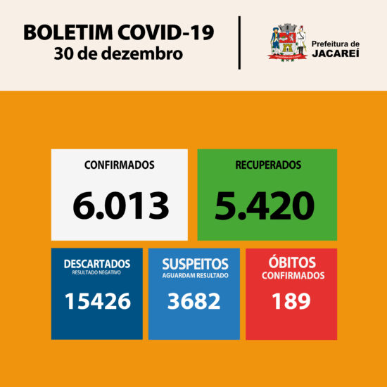 A Secretaria Municipal de Saúde de Jacareí, por meio da Diretoria de Vigilância em Saúde, informa, nesta quarta-feira (30), que Jacareí está com 6.013 casos confirmados de COVID-19 no município. São 3.015 homens e 2.998 mulheres. Dos confirmados, estão internados 35 (11 em hospital público – sendo seis em UTI –, e 24 em hospital privado – sendo 11 em UTI). Há 404 confirmados em isolamento (internados e em casa). E 189 óbitos até aqui.