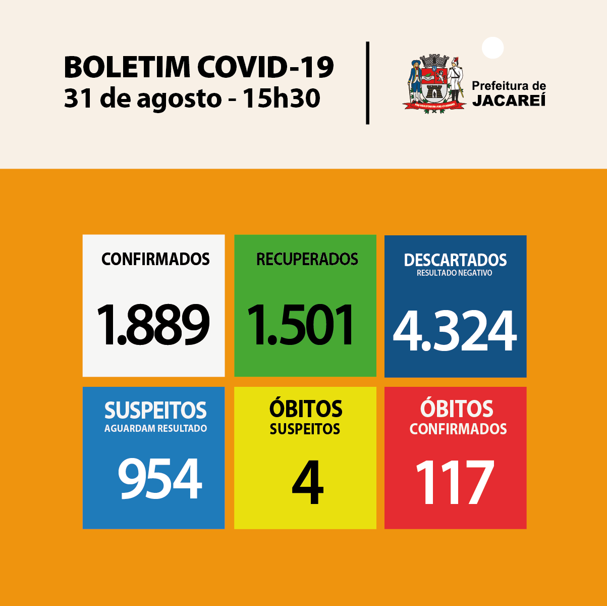 A Secretaria Municipal de Saúde de Jacareí informa, nesta segunda-feira (31), que chegou a 1889 casos confirmados de COVID-19 no município. São 966 homens e 923 mulheres. Dos confirmados, estão internados 17 (dez em hospital público – sendo três em UTI –, e sete em hospital privado – sendo quatro em UTI). Há 254 em isolamento domiciliar. E 117 óbitos, até aqui.