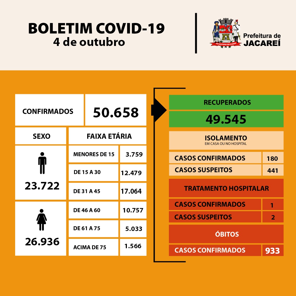 Jacareí está com 50.658 casos confirmados da doença. São 26.936 mulheres e 23.722 homens. Dos confirmados, está internado um (nenhum em hospital público e um em hospital privado – sendo ele em UTI). Há 180 confirmados em isolamento. E 933 óbitos até aqui.