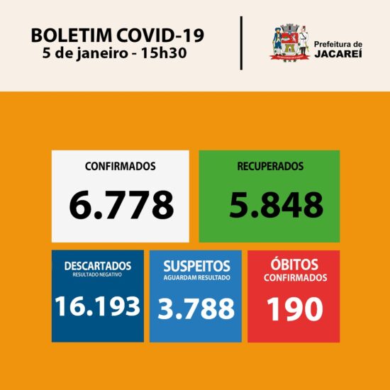 Jacareí está com 6778 casos confirmados da doença. São 3429 mulheres e 3349 homens. Dos confirmados, estão internados 34 (16 em hospital público – sendo 12 em UTI –, e 18 em hospital privado – sendo nove em UTI). Há 740 confirmados em isolamento (internados e em casa). E 190 óbitos até aqui.