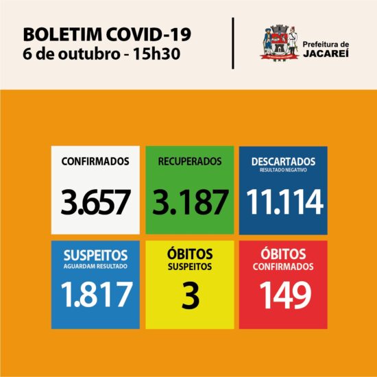 Jacareí chegou a 3657 casos confirmados da doença. São 1861 homens e 1796 mulheres. Dos confirmados, estão internados sete (três em hospital público – sendo os três em UTI –, e quatro em hospital privado – sendo um em UTI). Há 314 em isolamento domiciliar. E 149 óbitos, até aqui (4,0% dos casos confirmados).